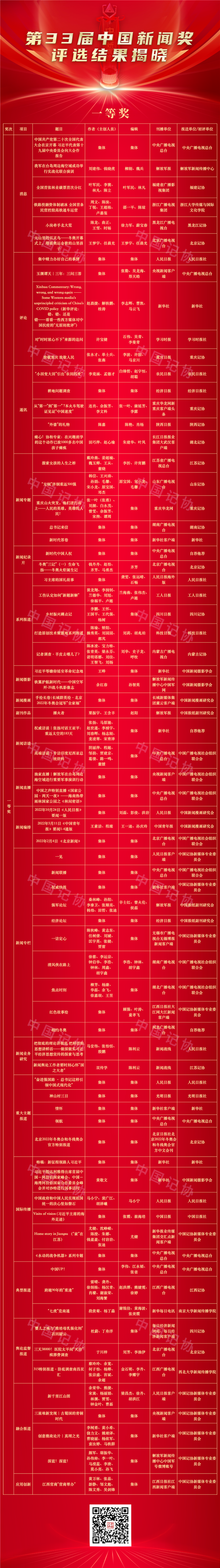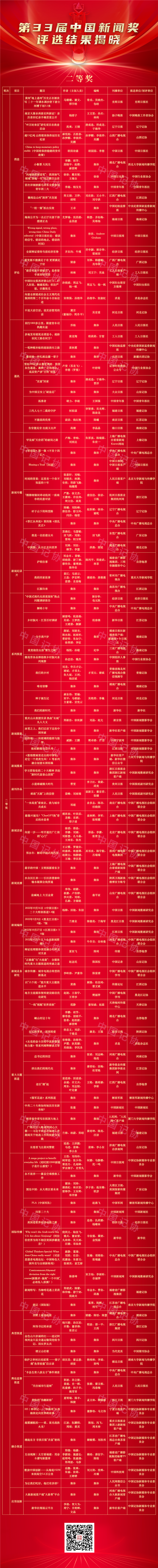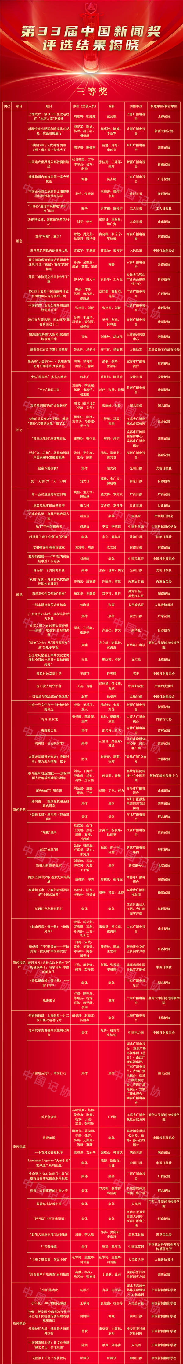 由中華全國新聞工作者協(xié)會主辦的第33屆中國新聞獎評選結(jié)果11月6日揭曉。來自全國各級各類媒體的377件作品獲中國新聞獎,其中,特別獎3件,一等獎73件,二等獎114件,三等獎187件。