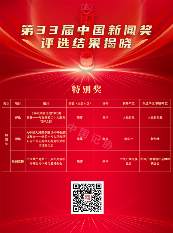 人民日報社評論《十年砥礪奮進 繪寫壯美畫卷——寫在黨的二十大勝利召開之際》、新華社通訊《為中國人民謀幸福 為中華民族謀復興——黨的十八大以來以習近平同志為核心的黨中央治國理政紀實》和中央廣播電視總臺新聞直播《中國共產(chǎn)黨第二十屆中央政治局常委同中外記者見面會》3件作品得到與會評委高度認同,獲選特別獎。
