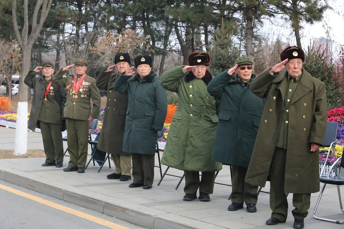 當(dāng)護(hù)送志愿軍烈士遺骸棺槨的騎警車隊(duì)即將抵達(dá)沈陽抗美援朝烈士陵園時,幾位已過耄耋之年的志愿軍老戰(zhàn)士顫顫巍巍地從凳子上起身。他們舉起右手,一齊向迎面駛來的車隊(duì)敬禮。