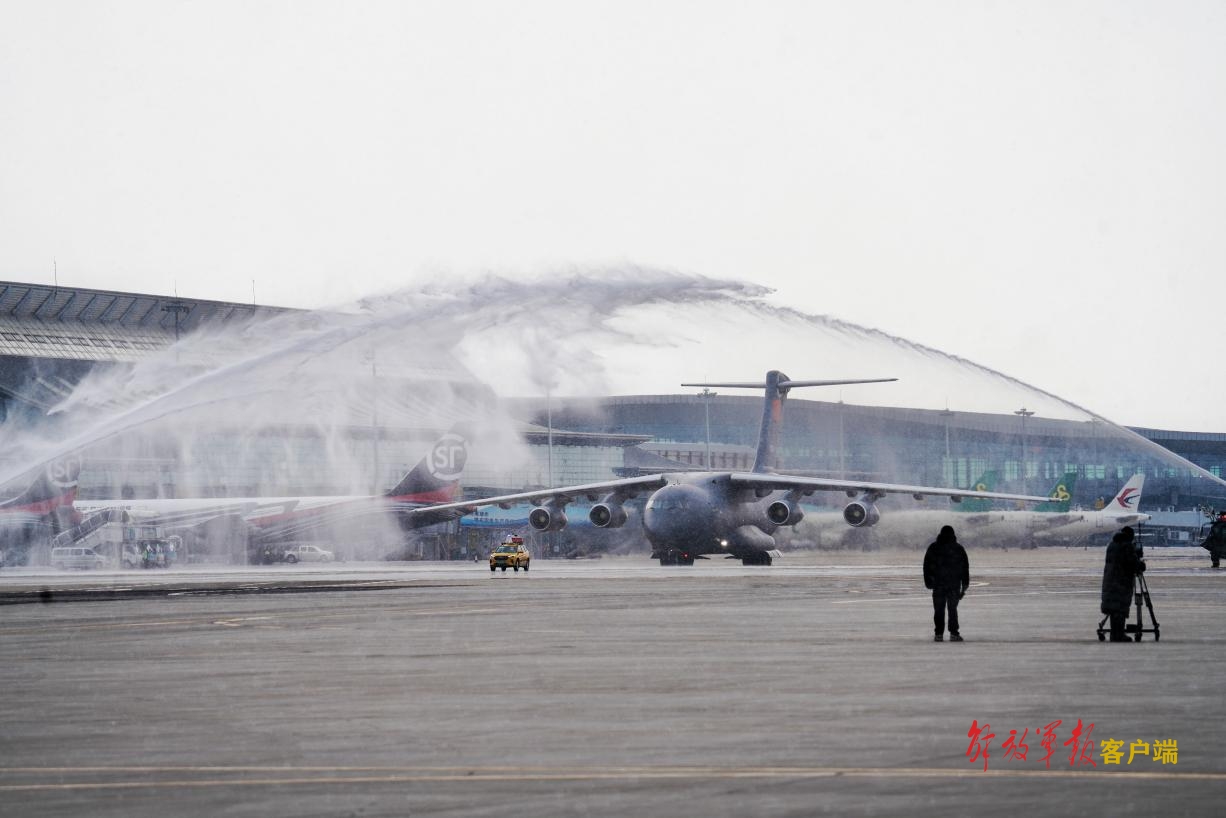滑行時,兩道水柱從跑道兩側(cè)的消防車中噴射而出,它們在拋物線最高點(diǎn)相遇,一道“水門”傾瀉而下,為搭載志愿軍烈士遺骸的運(yùn)-20專機(jī)接風(fēng)洗塵。