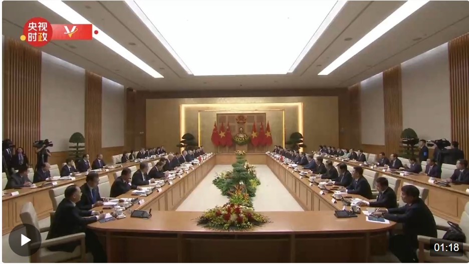 當前,中越關系持續(xù)向好發(fā)展。昨天,我同阮富仲總書記一道見證雙方簽署的合作文件,涵蓋了兩黨兩國合作的方方面面,充分說明中越關系的廣度和深度非同一般。我同阮富仲總書記一道宣布構建具有戰(zhàn)略意義的中越命運共同體,開啟了新時代中越關系新篇章,相信將為兩國人民帶來更大福祉,為地區(qū)和世界和平、穩(wěn)定、發(fā)展作出積極貢獻。