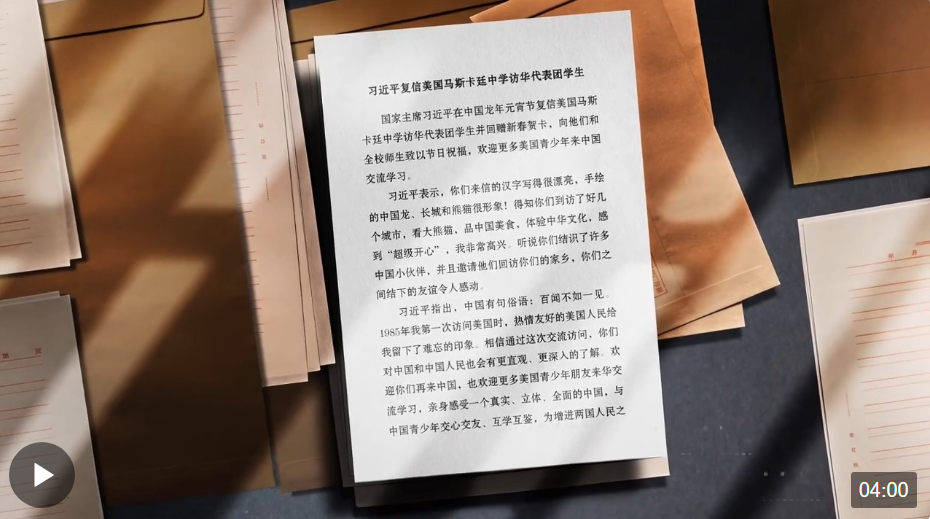 2023年11月,習近平主席訪美期間宣布,中方未來5年愿邀請5萬名美國青少年來華交流學習。美國艾奧瓦州友人薩拉·蘭蒂近期致信習主席,表示希望馬斯卡廷中學也參與這一計劃。