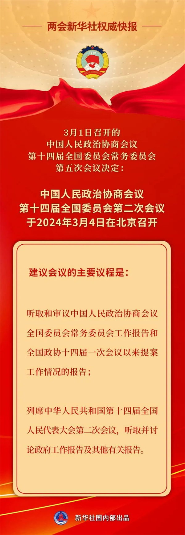 3月1日召開的中國人民政治協(xié)商會議第十四屆全國委員會常務(wù)委員會第五次會議決定:中國人民政治協(xié)商會議第十四屆全國委員會第二次會議于2024年3月4日在北京召開。建議會議的主要議程是:聽取和審議中國人民政治協(xié)商會議全國委員會常務(wù)委員會工作報告和全國政協(xié)十四屆一次會議以來提案工作情況的報告;列席中華人民共和國第十四屆全國人民代表大會第二次會議,聽取并討論政府工作報告及其他有關(guān)報告。