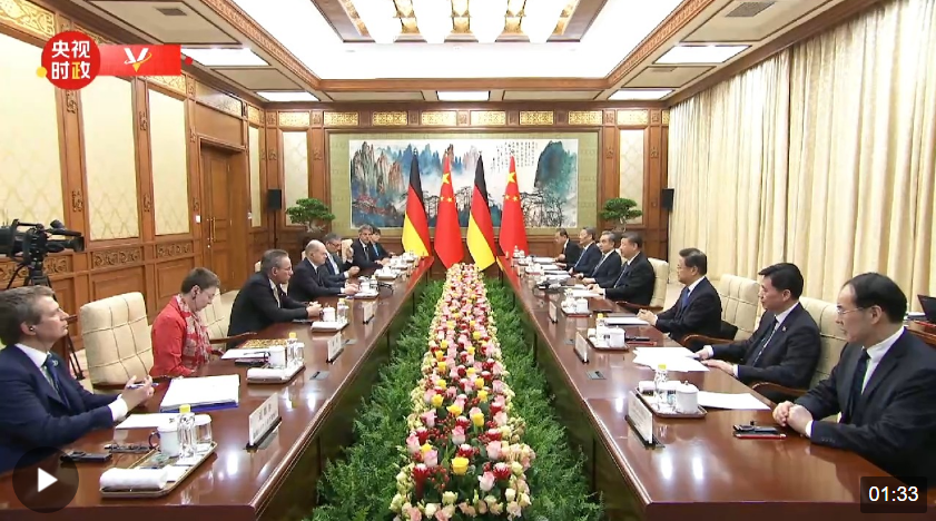 朔爾茨說:“主席先生,我很高興自2022年11月我上次來訪之后,兩國政府間進(jìn)行了深入的交流和多次對話。具有里程碑意義的是,去年六月在柏林成功召開的第七輪德中政府間磋商。在過去兩天我率領(lǐng)一個商務(wù)代表團(tuán),參觀了在重慶和上海的德國企業(yè),兩國的經(jīng)濟(jì)關(guān)系是非常重要的議題。”