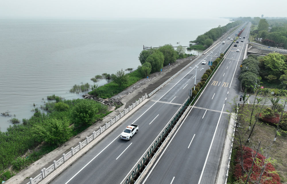 2024年4月11日,浙江省湖州市吳興區(qū)綜合行政執(zhí)法局高新區(qū)中隊(duì)執(zhí)法人員駕車在太湖沿岸巡查(無(wú)人機(jī)照片)。