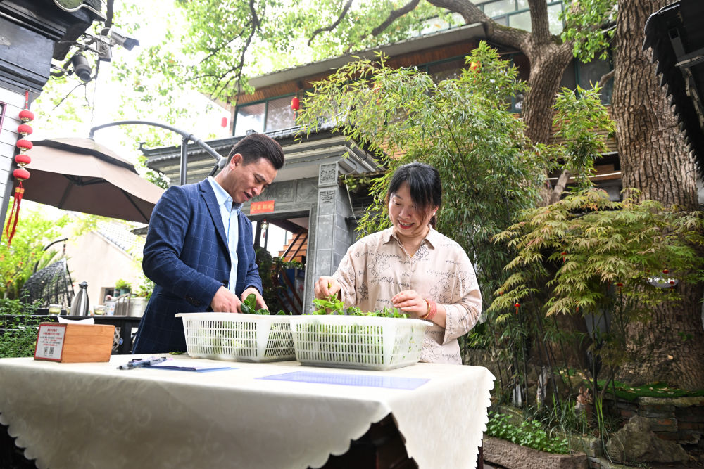 2024年4月11日,在江蘇省蘇州市吳中區(qū)金庭鎮(zhèn),退捕漁民沈雪榮和妻子沈燕燕在自家經(jīng)營(yíng)的農(nóng)家樂(lè)“美味漁家蟹園”擇菜。“退捕后,太湖的生態(tài)環(huán)境越來(lái)越好,游客越來(lái)越多,我們家的農(nóng)家樂(lè)生意也越來(lái)越紅火。”沈雪榮感慨道。