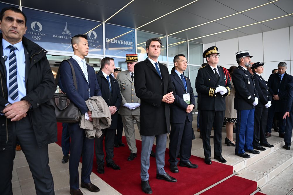 習(xí)近平乘坐專機(jī)抵達(dá)巴黎奧利機(jī)場時(shí),法國總理阿塔爾等法國政府高級(jí)代表熱情迎接。